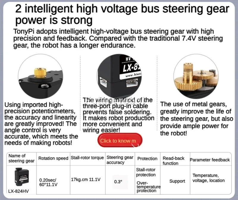 Servos: LX-824HV high-voltage bus servo + LFD-01M anti-stall servo