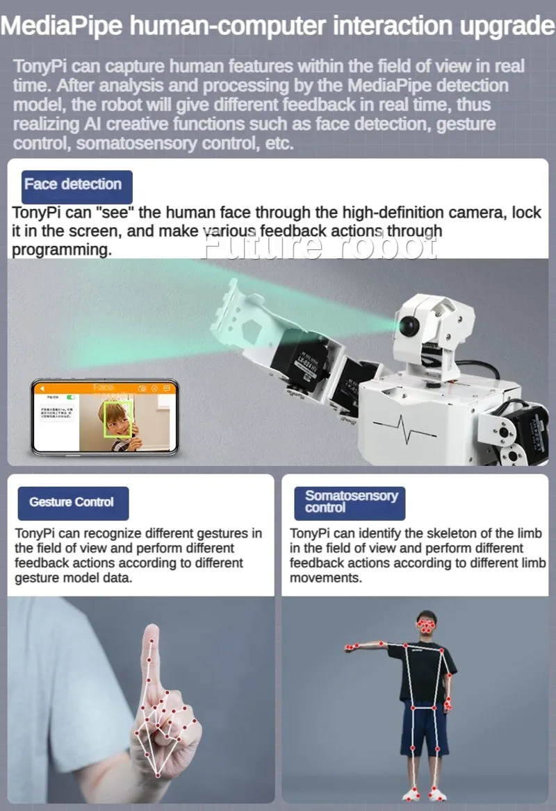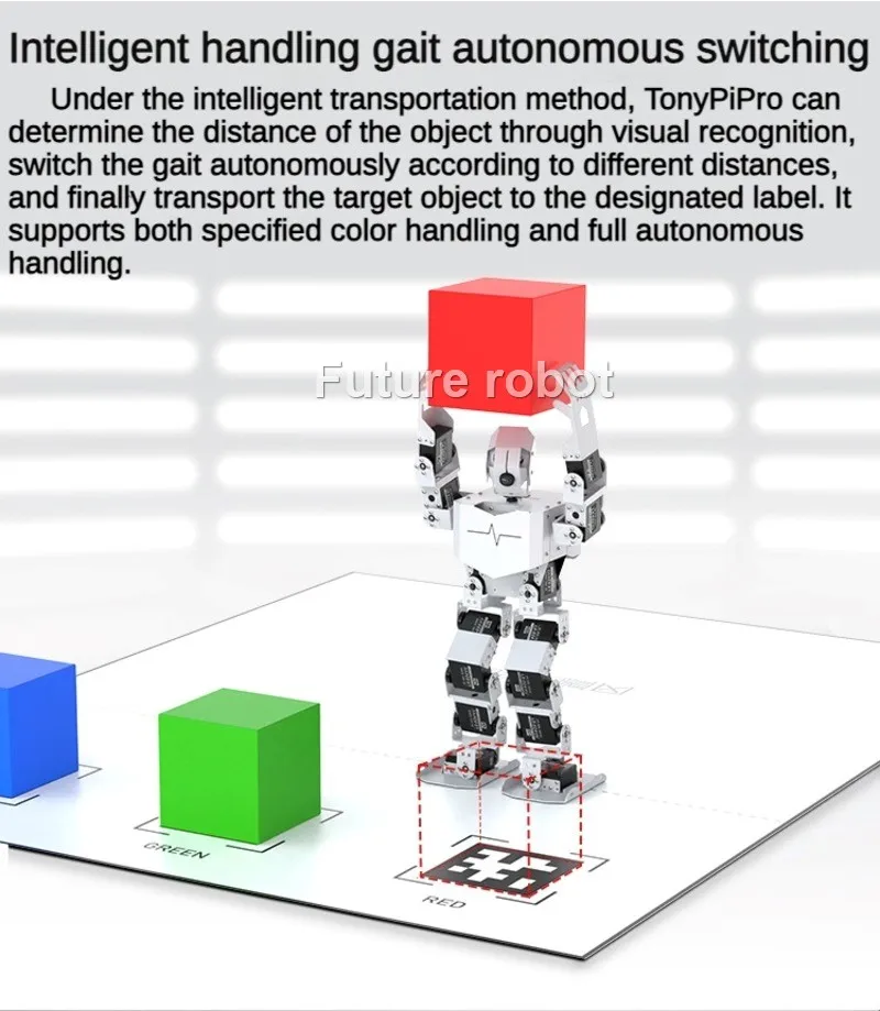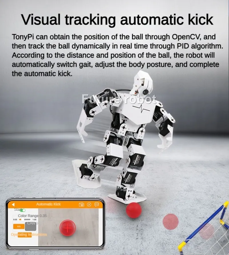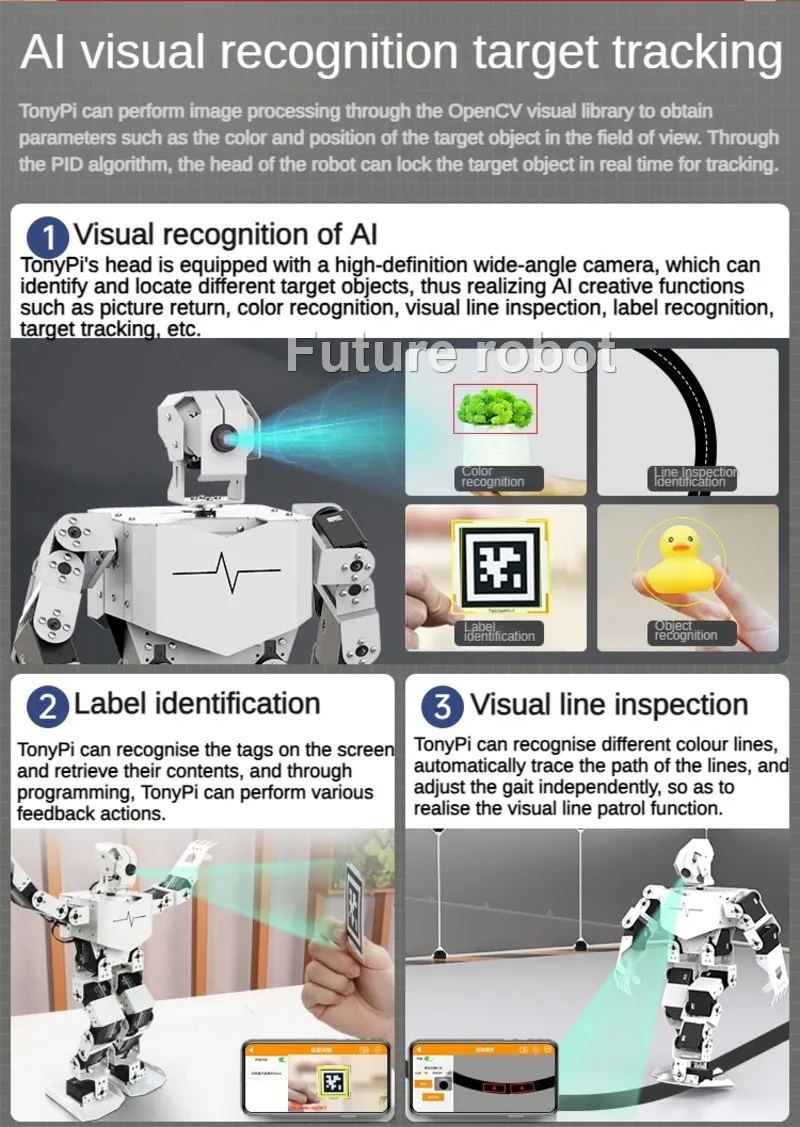 TonyPi intelligent visual humanoid robot uses Raspberry PI 4B as the main control, OpenCV as the image processing library and Python programming. It is equipped with 2 degrees of freedom high-definition wide-angle camera, can complete face recognition color tracking, label recognition, automatic kicking, visual patrol and other AI intelligent play, in this visual humanoid robot platform.