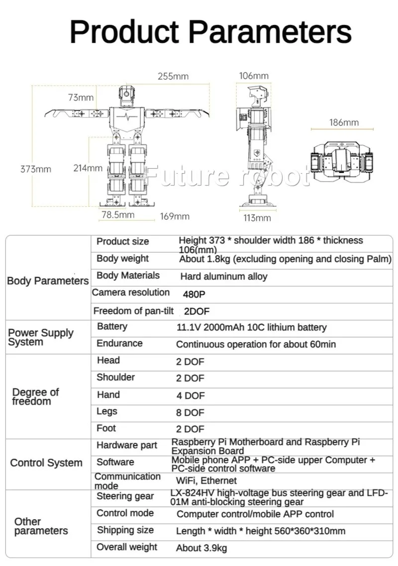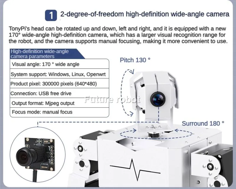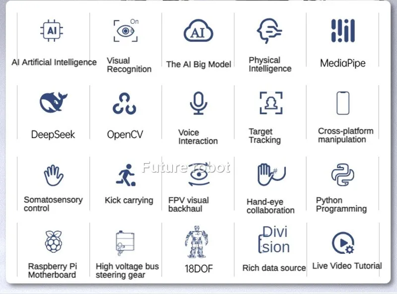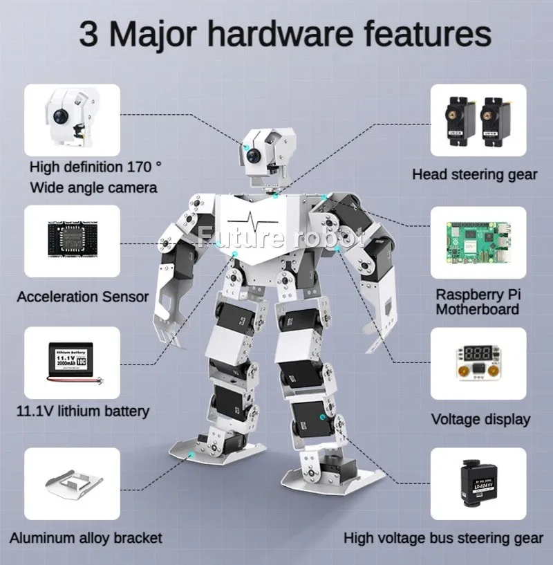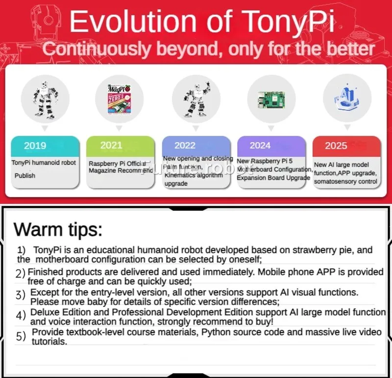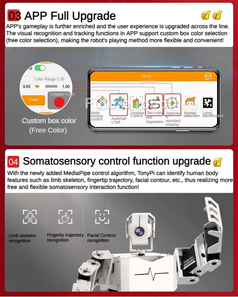 TonyPi intelligent visual humanoid robot uses Raspberry PI 4B as the main control, OpenCV as the image processing library and Python programming. It is equipped with 2 degrees of freedom high-definition wide-angle camera, can complete face recognition color tracking, label recognition, automatic kicking, visual patrol and other AI intelligent play, in this visual humanoid robot platform.