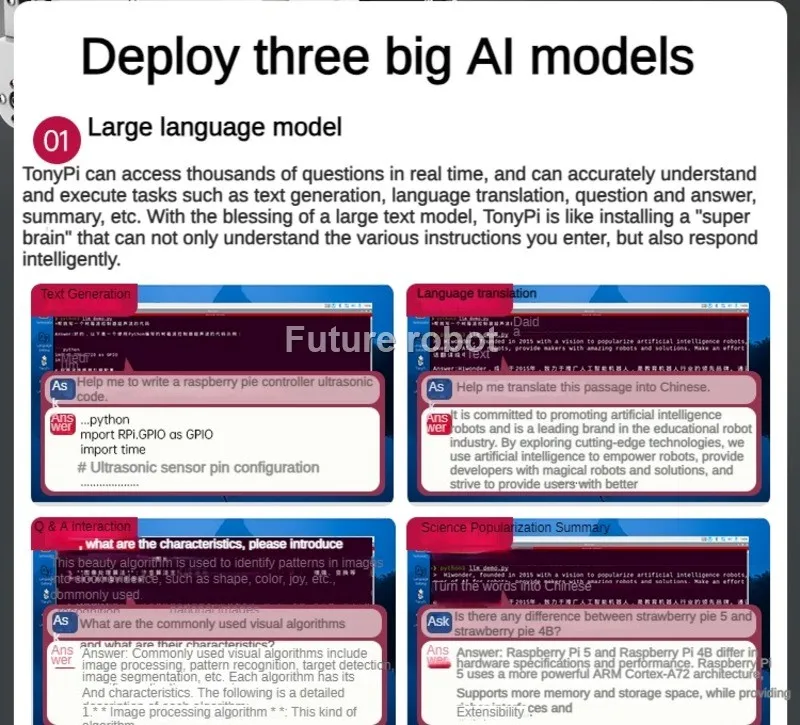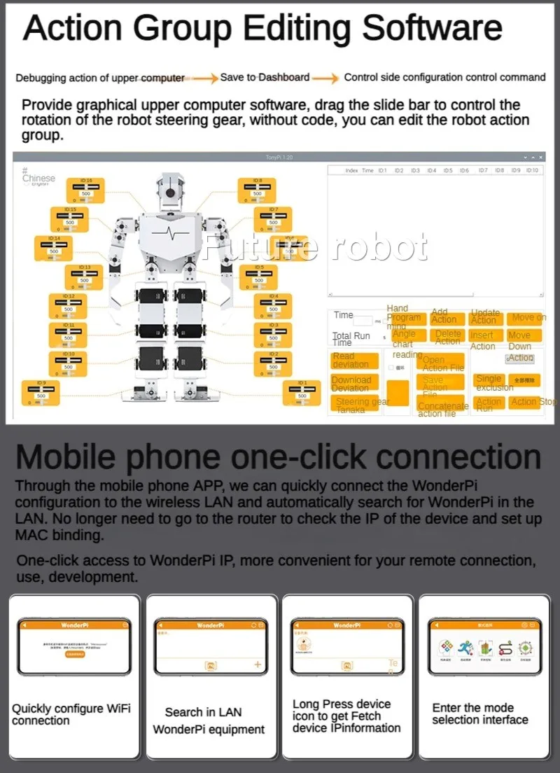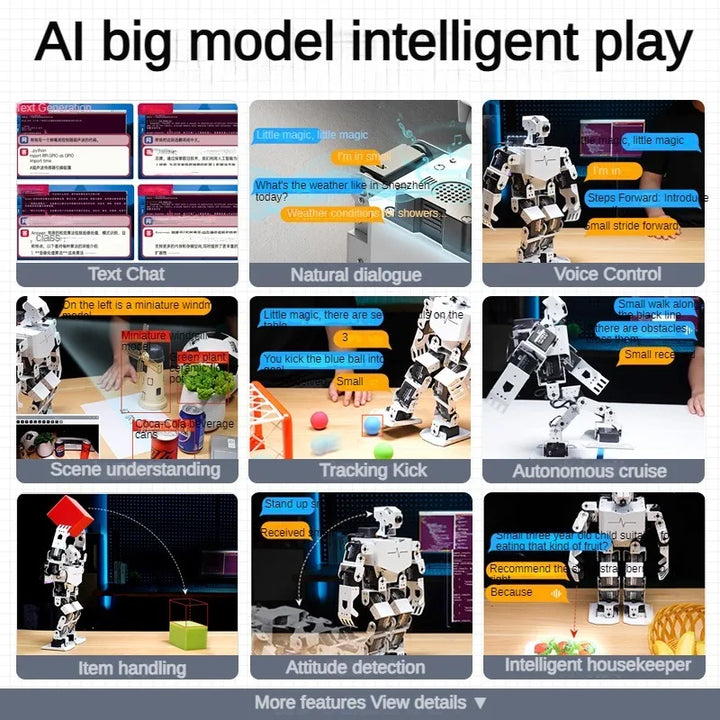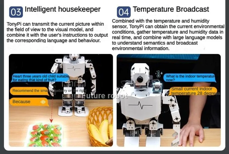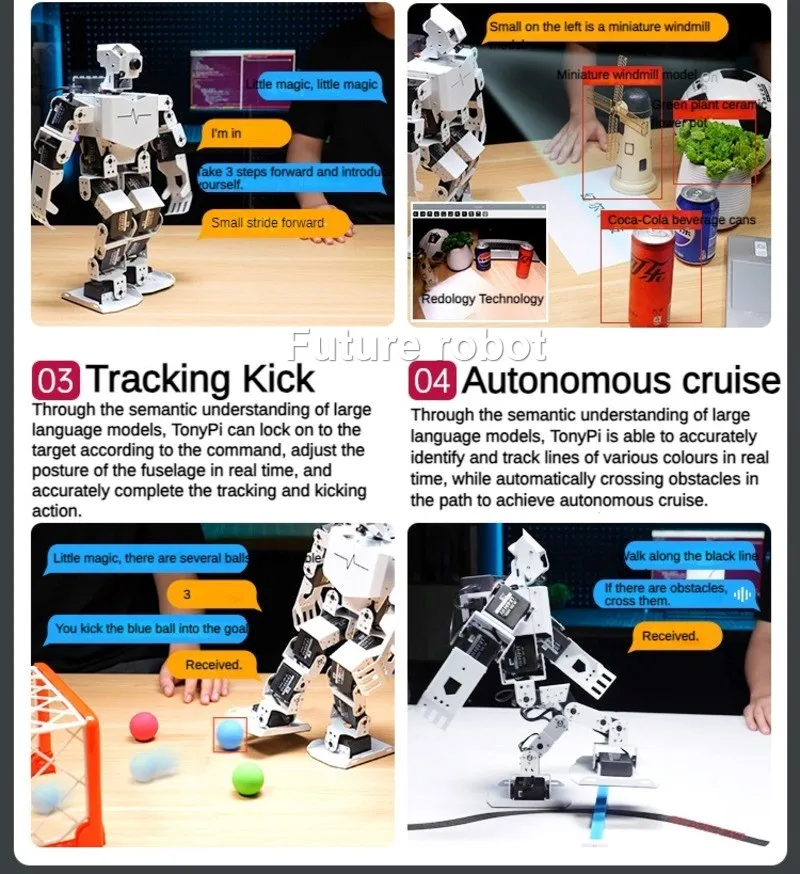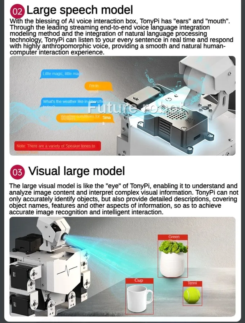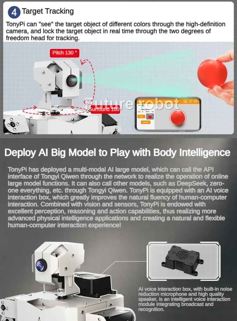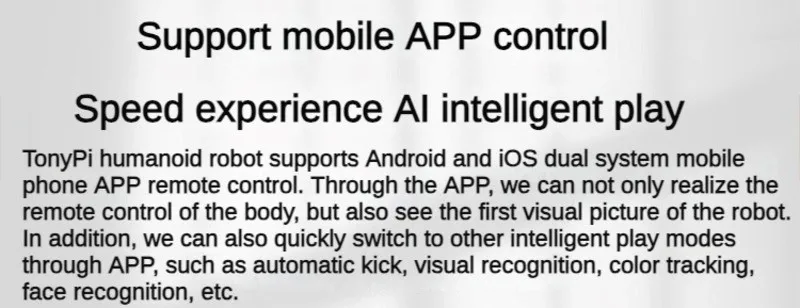 TonyPi humanoid robot not only supports APP control, but also can combine speech recognition module and speech synthesis module to realize intelligent voice interactive robot intelligent handling items and other gameplay. We provide detailed tutorial information open Python source code, so that you can quickly play AI intelligent robots!
