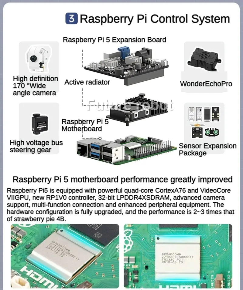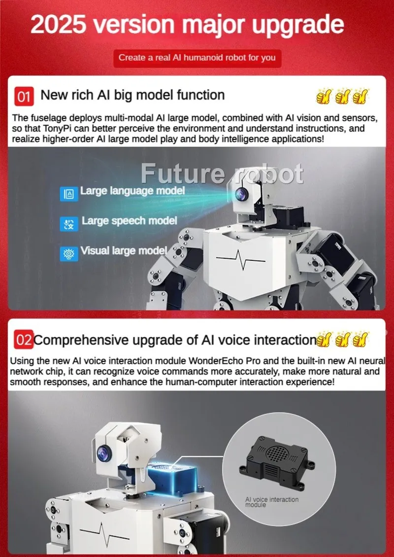 Equipped with an AI vision module, WonderEcho voice interaction module, WiFi, ultrasonic sensors, accelerometers, temperature & humidity sensors, and more, Tonybot not only supports basic functions like obstacle avoidance, fall recovery, and touch sensing but also advanced creative projects such as AI visual interaction, AI language interaction, and IoT applications.