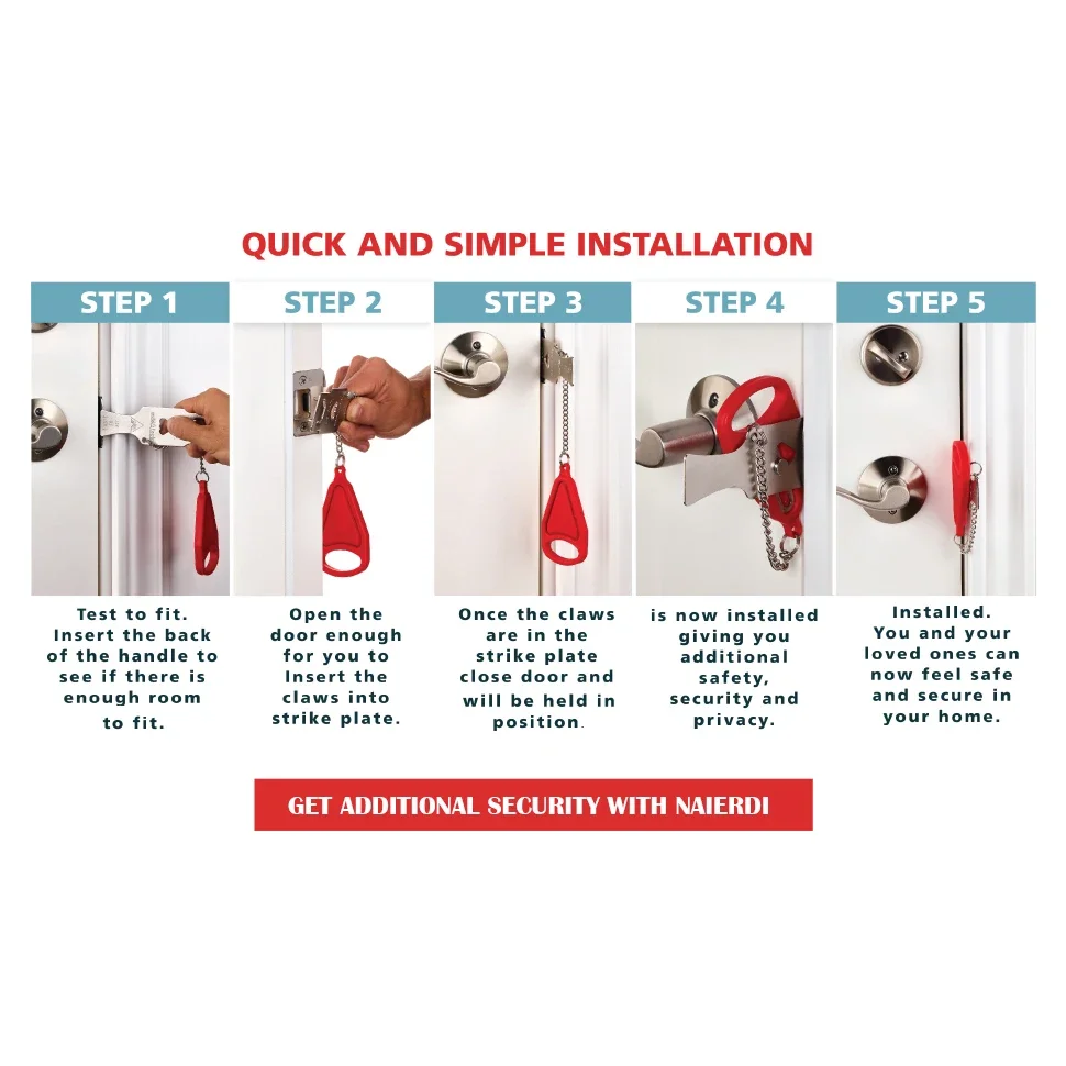 2. FÁCIL DE USAR-Fácil de instalar ou remover, esta fechadura da porta pode ser instalada em segundos sem ferramentas, mesmo em situações de emergência e no escuro. Basta inserir a peça de metal na ranhura da fechadura da porta, fechar a porta e, em seguida, colocar a ranhura vermelha no parafuso prisioneiro na folha de metal, então ninguém pode abrir a porta de fora.