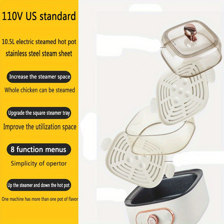 2 in 1 Smart Home Electric Steamer, Multifunctional Electric Hot Pot, 2-Tier 8 Modes 2.77gal Large Capacity Suitable for 3-5 People, Steamer, with Boil Dry Protection 110V 1200W, Breakfast Steamer, Electro-mechanical Cooking
