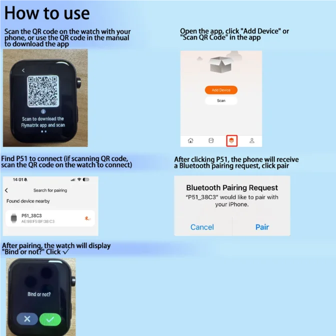 3Find P51 to connect (if scanning QR code, scan the QR code on the watch to connect)