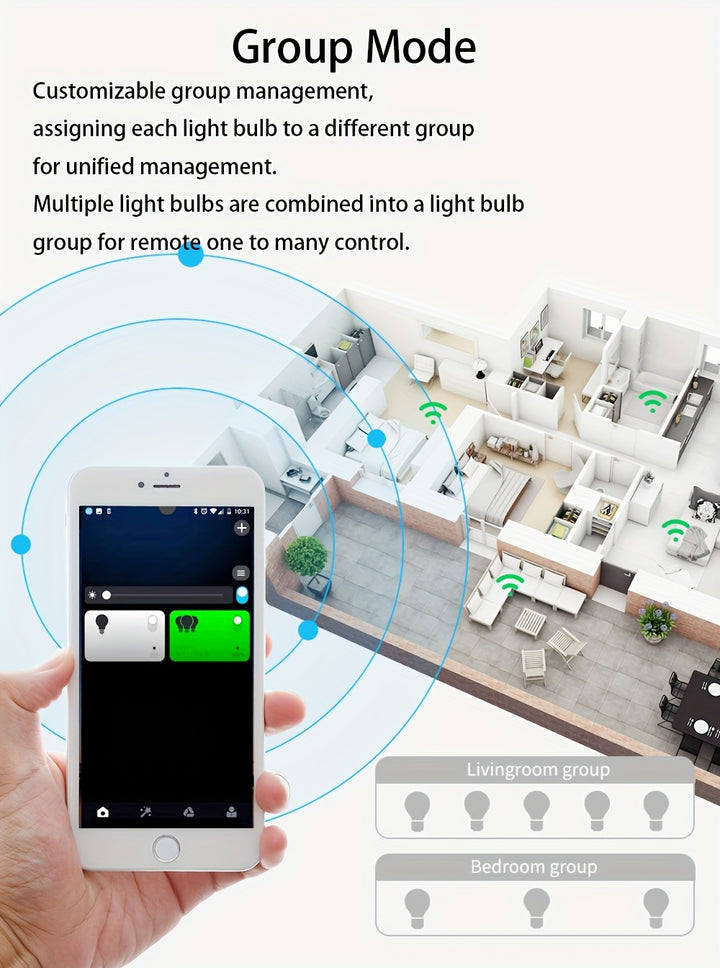 Features of the product include: 1. A high-quality smart light bulb that connects via WiFi and wireless methods, allowing for remote individual control. 2. Options for timer and delay switches. 3. Control through a mobile app, enabling one-to-many management where a single group can handle 6-8 devices, with the ability to create groups for control. 4. RGB full-color adjustments with 16 million color options and CT color temperature settings ranging from 2700K to 6500K, along with brightness adjustments. 5. Comes with 20 built-in dynamic modes. 6. Allows for DIY saving of specific colors.