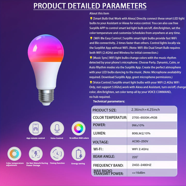 Specifications of the product include: 1. Control method: WiFi+ble+2.4G for the third mock test 2. APP software type: Surplife 3. Mobile version requirements: Android 4.0/iOS 9.0 or higher 4. Channels: 5 (RGB+CT) 5. Power consumption: 9W 6. Power factor: 0.6 7. Brightness: 800lm 8. Light angle: 120 degrees 9. Color temperature range: 2700K-6500K 10. LED bead count: R/G/B:2835-1W*3, WW:2835-1W*6, CW:2835-1W*6 11. Operating voltage: 100-130VAC, 50/60HZ 12. Socket type: E26