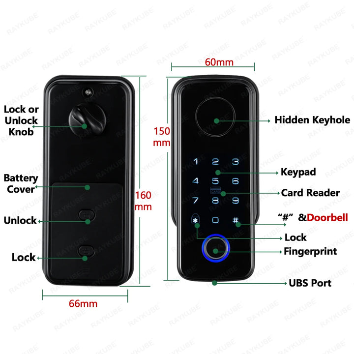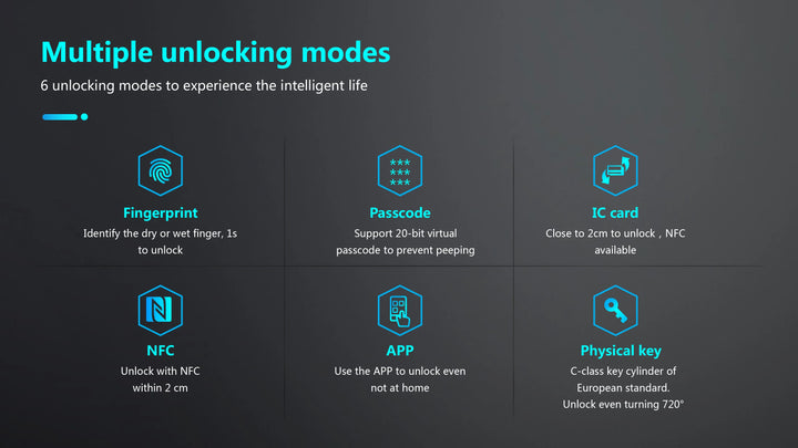 Unlock methods: TT Lock APP / Fingerprints / Passwords / Smart Cards / NFC/ Metal Keys Unlock