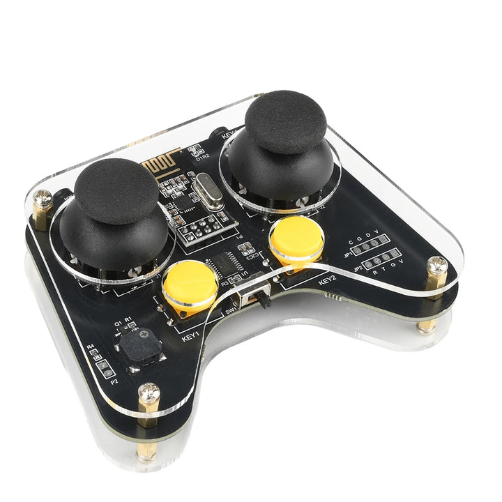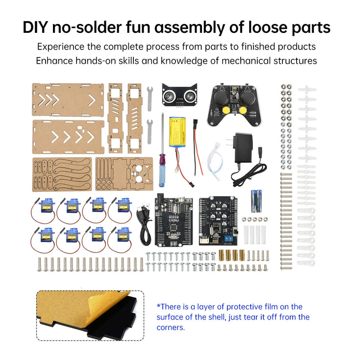 2. Body with acrylic lightweight design, and equipped with 8 servos, legs with linkage structure design, flexible and rich action. 2.4G wireless remote control, you can easily realize the free walking, forward, backward, turn left turn right turn, upright, standing, handshake, sit down, get down, push-ups, frog jump and so on.The head of the robot dog is equipped with HXFB super sonic obstacle avoidance module, real-time detection of the front automatically avoid obstacles.