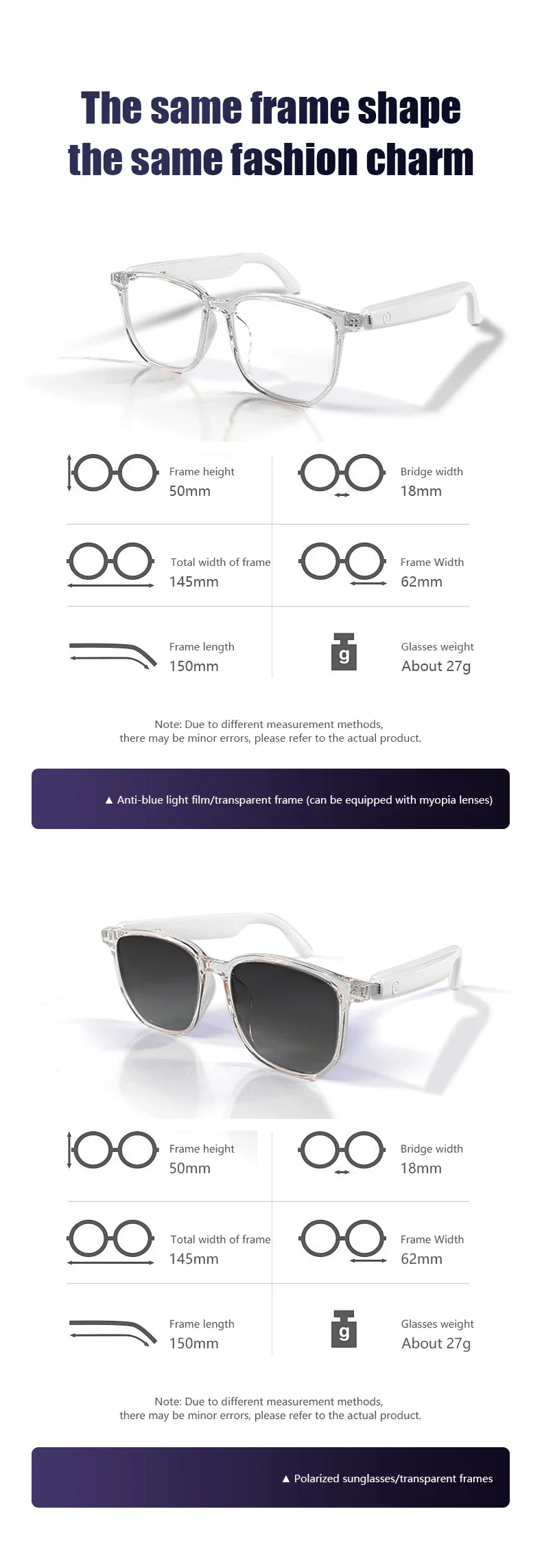 AI voice wake-up, AI photo recognition, AI intelligent question-and-answer interaction, AI smart translation, high-definition photography and video recording (with anti-shake function), recording, Wi-Fi transfer of photos, videos, and recordings to phone, slide to adjust volume, wear detection, dual microphone noise reduction, call noise reduction, intelligent voice assistant, Bluetooth calls, music playback (switch, pause music), low power consumption Jerry + Allwinner main control chip, long-lasting battery life, dual physical buttons plus slide touch for convenient operation, 28 grams lightweight overall weight for comfortable wearing, customizable sunglasses, blue light protection, color-changing, myopia, and other lenses, {need to be customized}