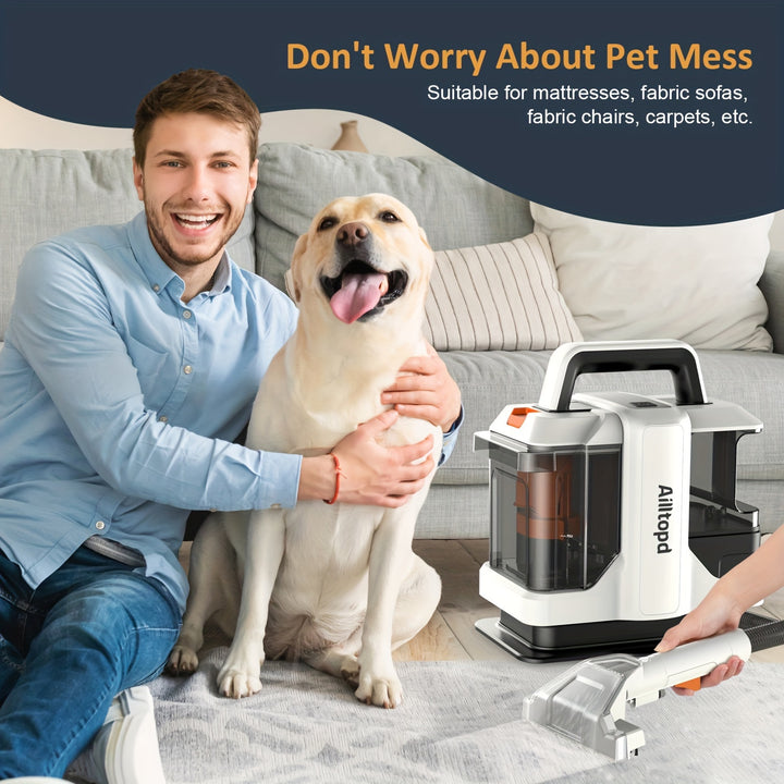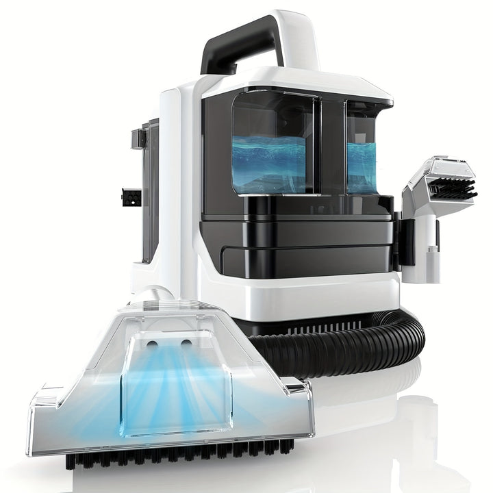 A compact 450W handheld carpet cleaner for sofas and curtains, featuring spray suction and integrated cleaning tools. Ideal for cleaning cars, windows, and bathrooms with powerful suction and versatile tools, making home cleaning smarter.