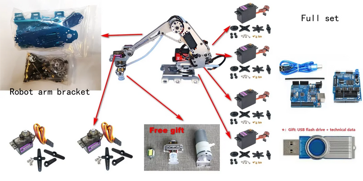 Arduino full set= 1 set 6 dof robot arm Frame+ 4pcs MG996 servos+ 2pcs mg90 servos+ 1pcs arduino uno board+ 1pcs servo driver board+ 1pcs usb cable+