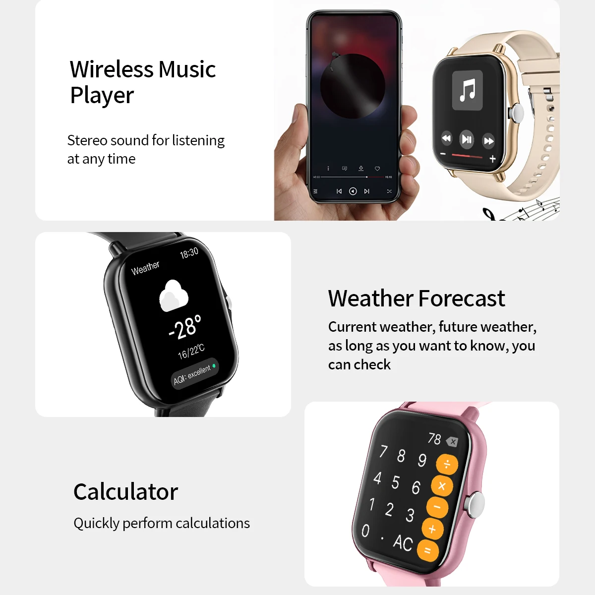 Function: Passometer,Message Reminder,Call Reminder,Answer Call,Dial Call,Calorie Counter,Calculators