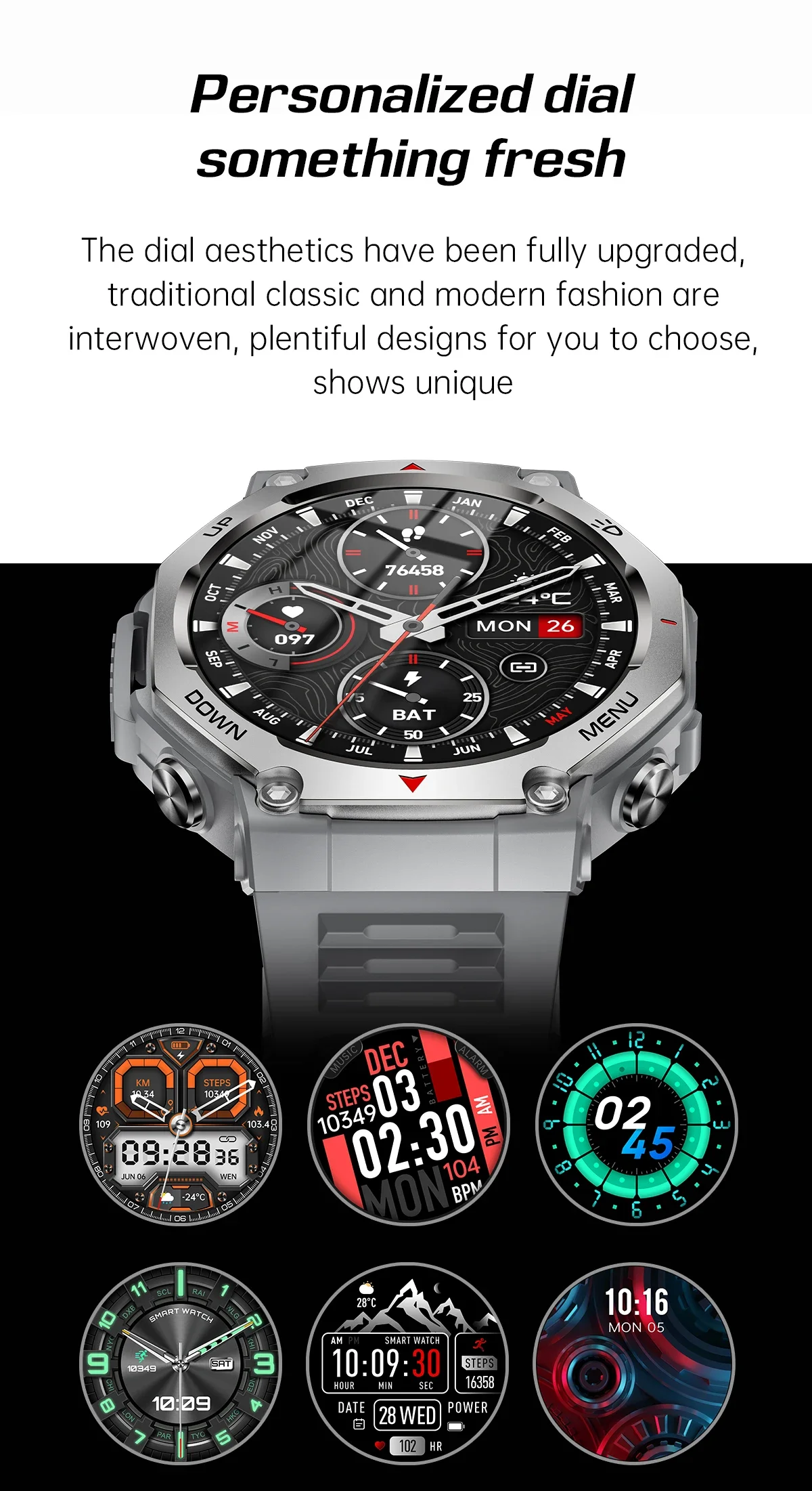 Function: Passometer,fitness tracker,sleep tracker,Message Reminder,Call Reminder,Answer Call,Dial Call,Push Message,Altitude Meter,24 hour instruction,Chronograph,Alarm Clock,World Time,Calorie Counter,DIVER,week,Month,Heart Rate Tracker,Interactive Music,Noctilucent,Calendar,Lighting,Countdown,Calculators