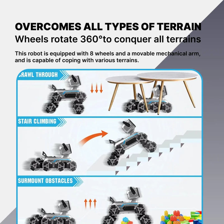 Equipped with 8 durable wheels and swinging arms, the robot tackles grass, gravel, stairs, sand, and more — adventure-ready indoors or out.