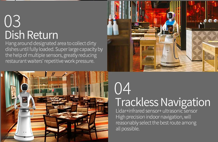 Precision navigation to deliver dishes to designated points; The shock absorption system effectively enhances the stability of the driving process and prevents the dishes from spilling out.