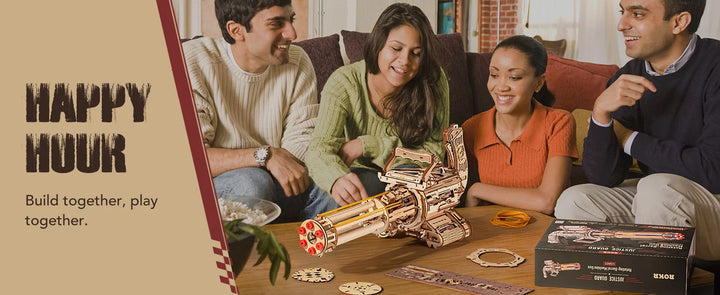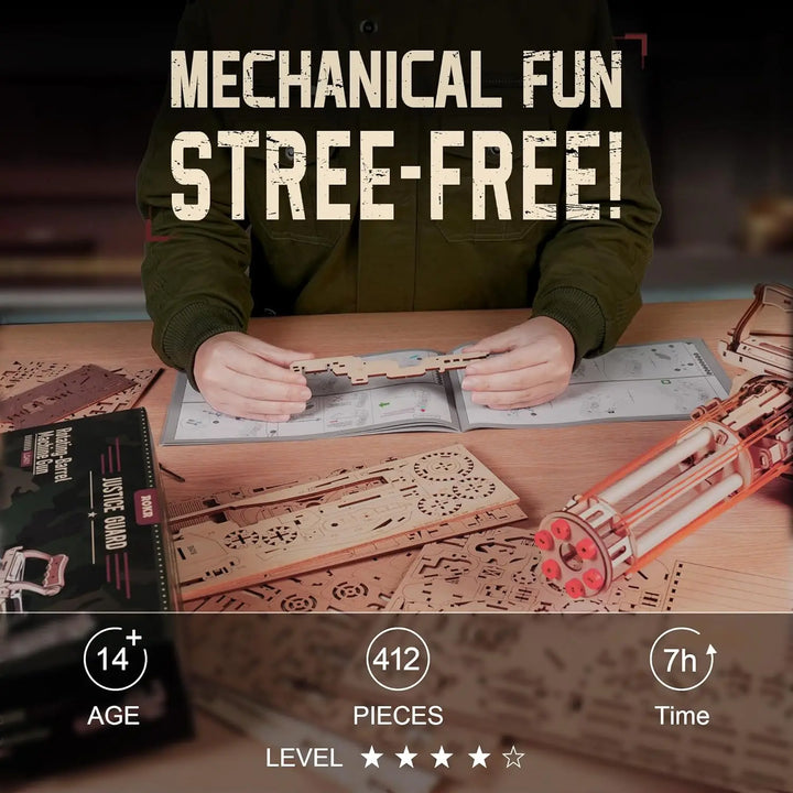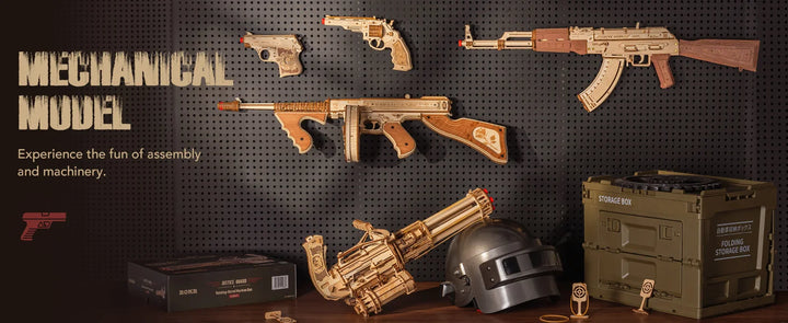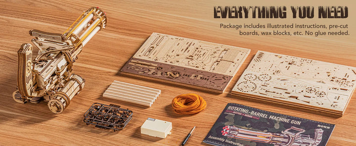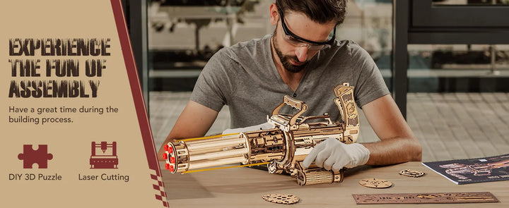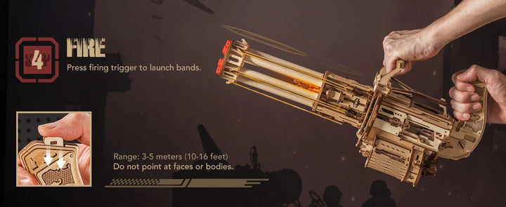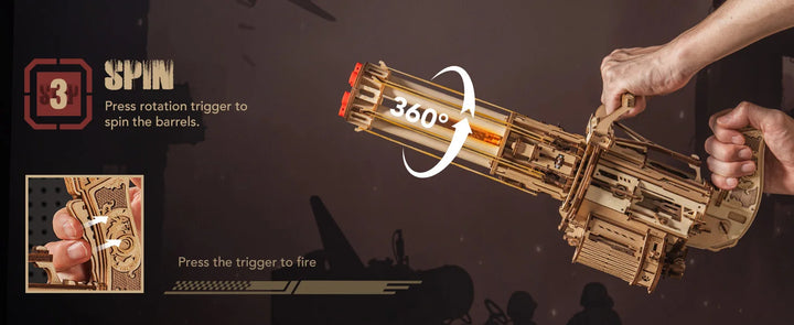 Robotime Rokr Rotating-Barrel Machine Gun Toy 3D Wooden Model Kits with Rubber Bands Build Mechanical Building for Adults