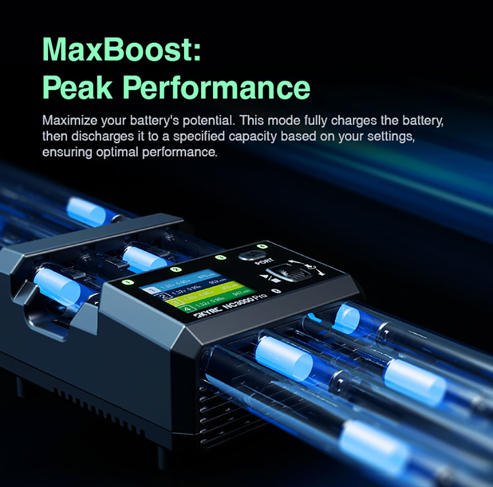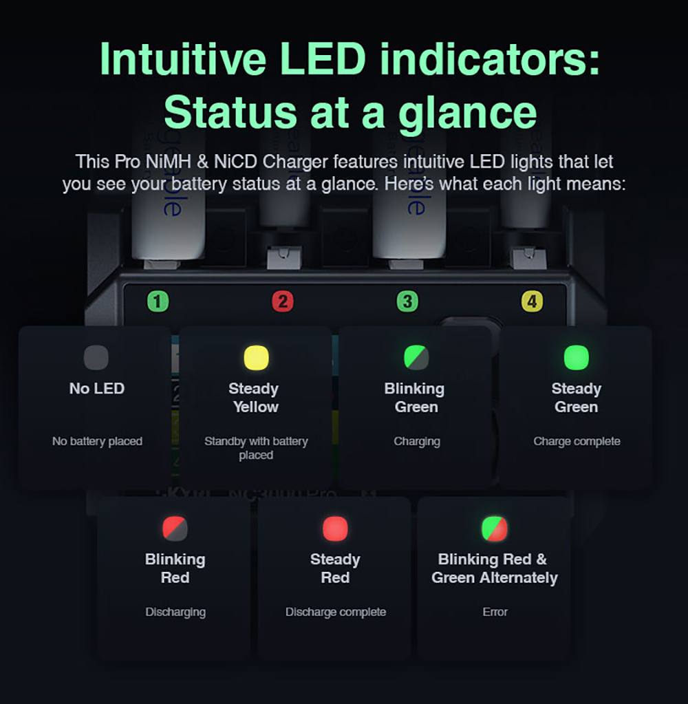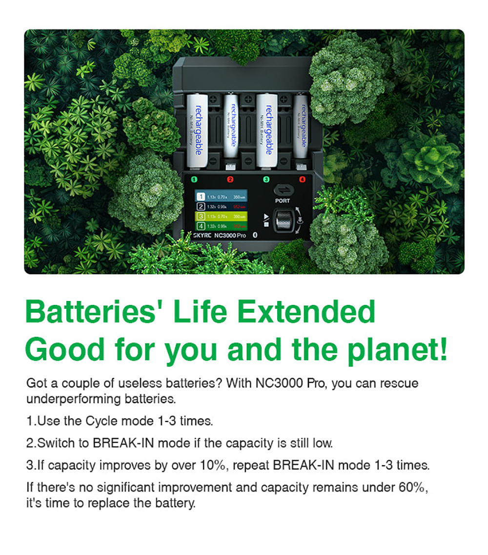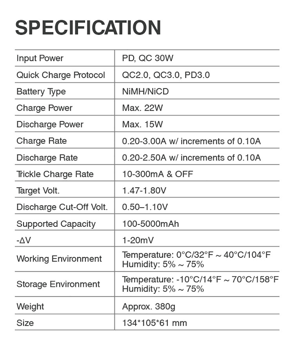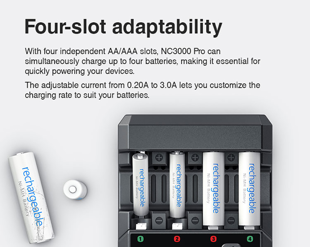 3. With four independent AA/AAA slots, NC3000 Pro can simultaneously charge up to four batteries, adjustable current from 0.20A to 3.0A.