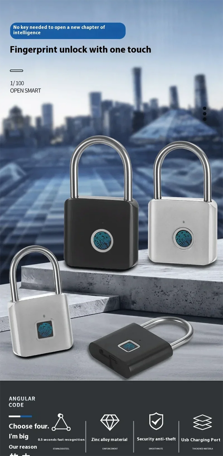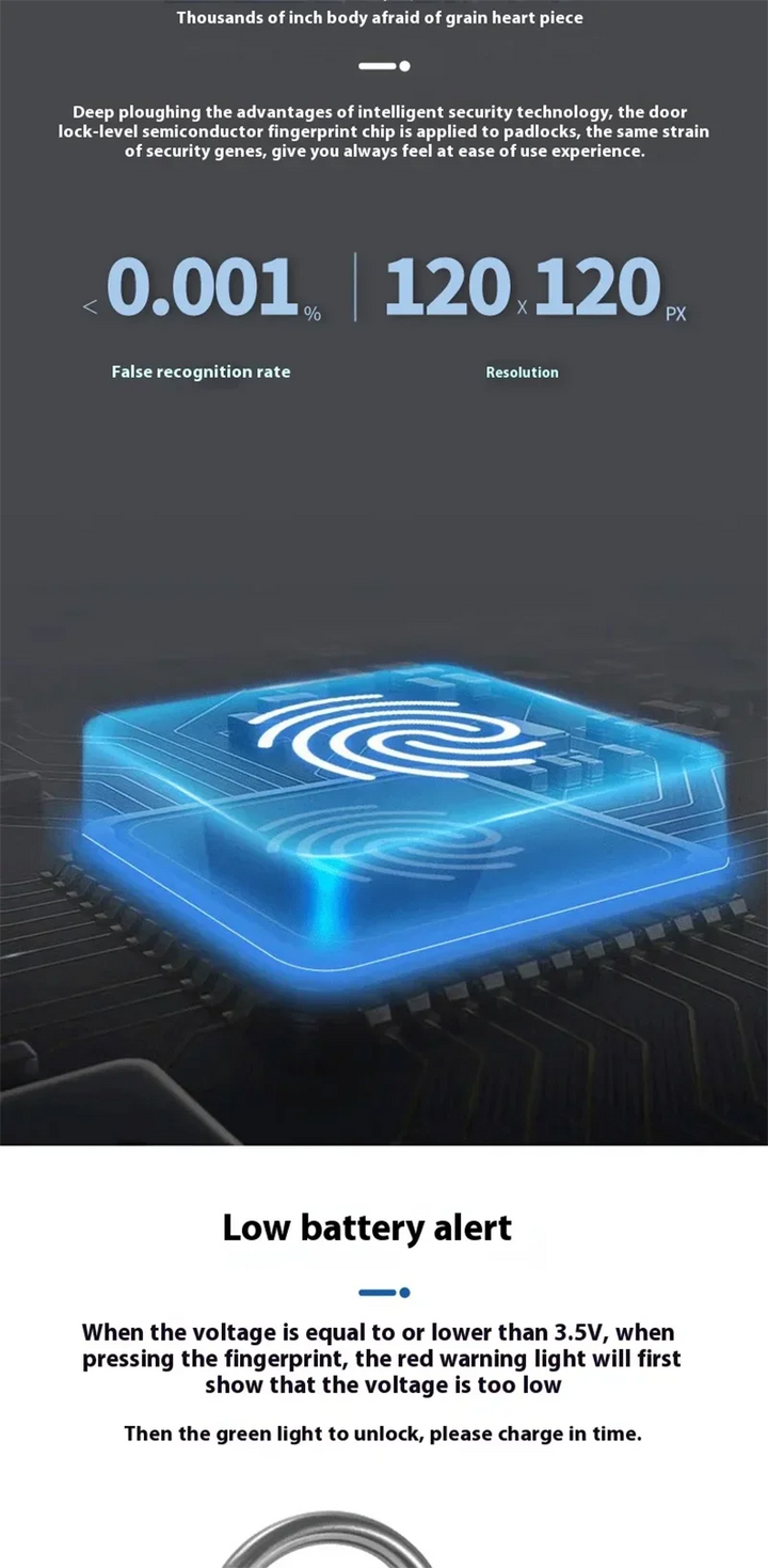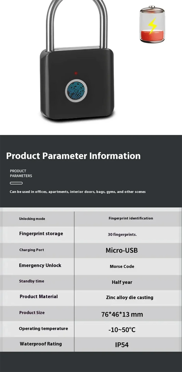 • FINGERPRINT Unlock Method :The product uses fingerprint technology to unlock, which means it's easy to use and highly secure.
