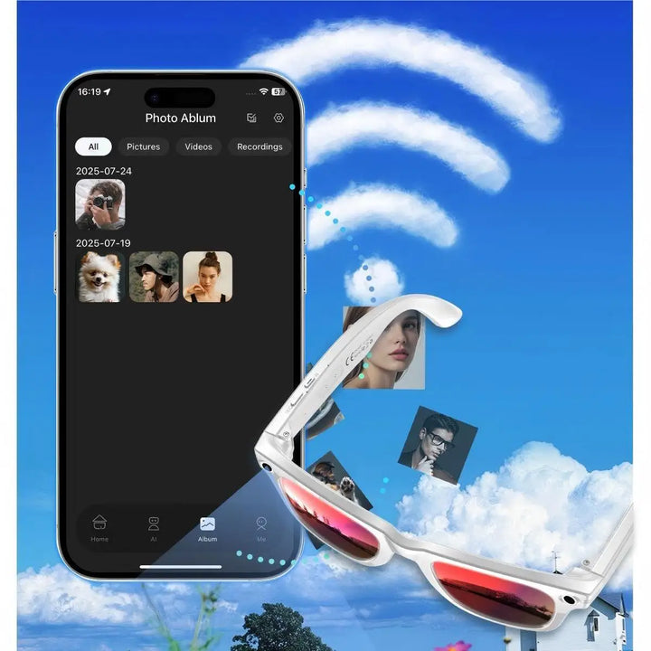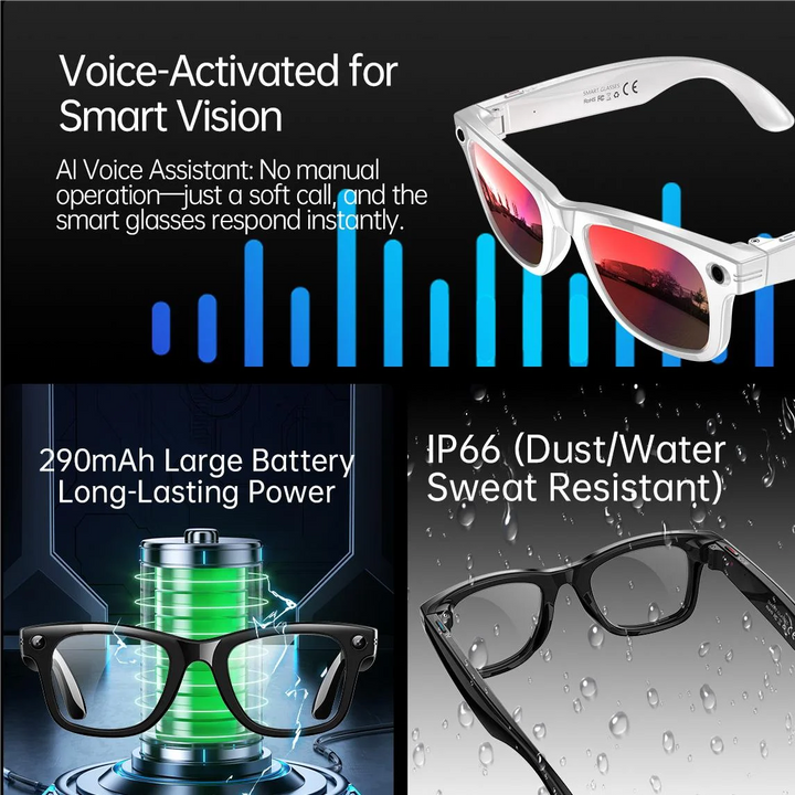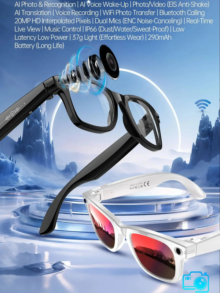 AI photo object recognition with answers, AI voice wake-up, AI intelligent Q&A interaction, and AI translation. It supports photography, video recording (with anti-shake function), and audio recording. It can transfer photos, videos, etc. to mobile phones via WIFI. It features slide touch for volume adjustment and wear detection. Equipped with dual microphones with ENC noise reduction, it supports Bluetooth calling and music playback (with track switching and pause for music enjoyment). It adopts Jerry + Allwinner main control chips with low power consumption and low latency, ensuring long battery life. It offers convenient operation with two physical buttons plus slide touch, an ultra-light 37g design for a weightless wearing experience, and is configurable with various lenses such as sunglasses, blue light-blocking, photochromic, and myopic lenses. It has a 290mAh large battery and an IP66 rating for dust, water, and sweat resistance.