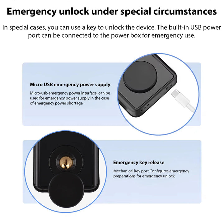 【Versatile Compatibility】: Designed with versatility in mind, our smart lock recognizes the left or right direction automatically upon power supply and offers one-touch lock/unlock functionality. Having BT function. It also includes a micro USB emergency power interface, allowing for emergency power supply in situations where power is scarce.