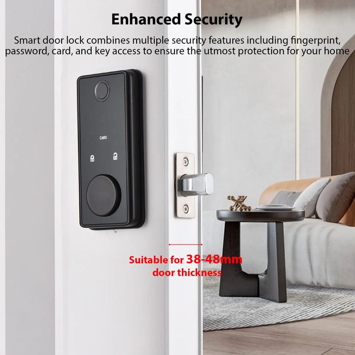 【Enhanced Security】: Our smart door lock combines multiple security features including fingerprint, password, card, and key access to ensure the utmost protection for your home. With a sturdy construction suitable for 35-60mm door thickness, it provides reliable security for different types of doors.