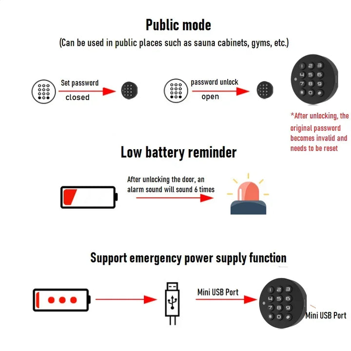 Public mode: Set the password before closing the door. After opening the door, this password will automatically expire and needs to be reset