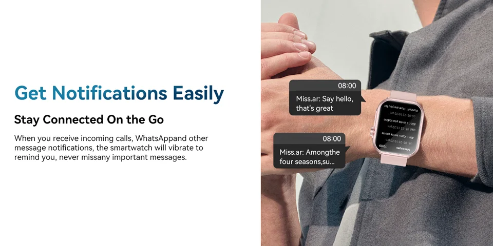 ➤Everyday smart features: Smart notifications (notifications for incoming calls, SMS, Facebook, Twitter, WhatsApp, Gmail and other apps), weather forecast, music playback, remote camera, voice recording, find your phone, do not disturb mode, sedentary reminder, drinking reminder, passcode.