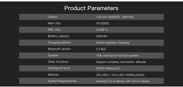 1.43-inch AMOLED display,466 x466 high resolution, Rich and detailed colors, Low power consumption,Clear visuals under direct sunlight, Expansive viewing area, Responsive touch technology.
