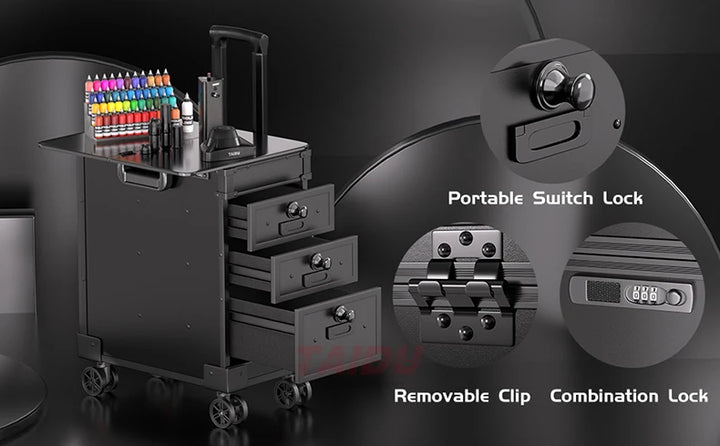 2. Large Storage Space: This tattoo case offers a variety of storage options with its 3 drawers with large capacity for pigments, gloves and other tattoo tools. These drawers have a locking buckle function that ensures the stability and safety of the case and prevents the loss of items. Ideal for taking exactly what you need, anywhere, at any time